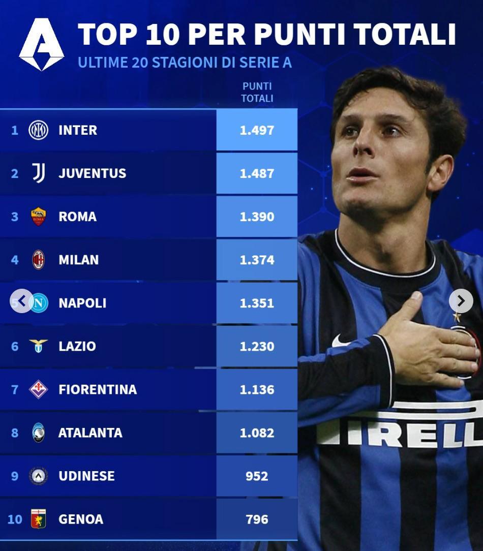 意甲近20年总积分TOP10: